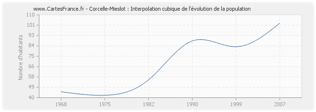 Cette courbe reprend l'historique de la population de Corcelle-Mieslot de 1968 à 2007 en interpolation cubique. Ceci permet d'obtenir plus précisément la population de la commune de Corcelle-Mieslot les années ou aucun recensement n'a été effectué.