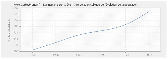 Cette courbe reprend l'historique de la population de Dannemarie-sur-Crète de 1968 à 2007 en interpolation cubique. Ceci permet d'obtenir plus précisément la population de la commune de Dannemarie-sur-Crète les années ou aucun recensement n'a été effectué.