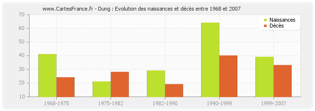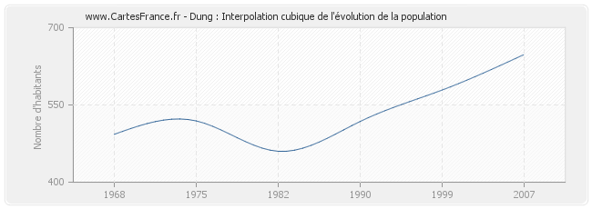 Cette courbe reprend l'historique de la population de Dung de 1968 à 2007 en interpolation cubique. Ceci permet d'obtenir plus précisément la population de la commune de Dung les années ou aucun recensement n'a été effectué.