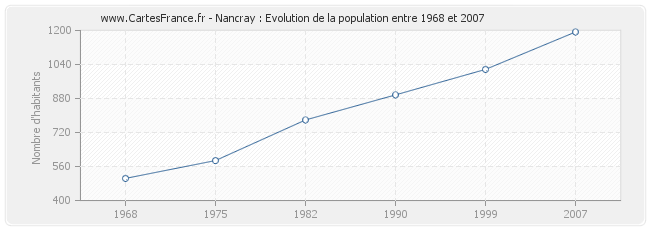 La population de Nancray était de 1 193 habitants en 2007, 1 017 habitants en 1999, 897 habitants en 1990, 779 habitants en 1982, 588 habitants en 1975 et 504 habitants en 1968.