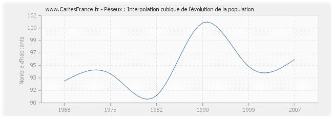 Cette courbe reprend l'historique de la population de Péseux de 1968 à 2007 en interpolation cubique. Ceci permet d'obtenir plus précisément la population de la commune de Péseux les années ou aucun recensement n'a été effectué.