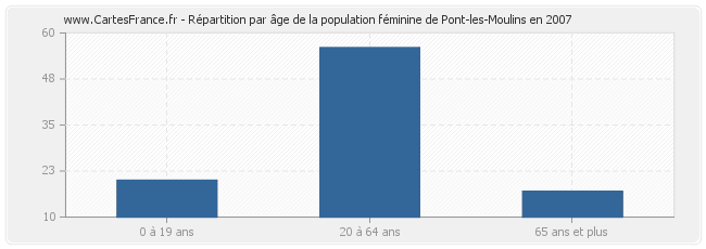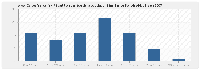 Répartition de la population féminine de Pont-les-Moulins par âge en 2007 :