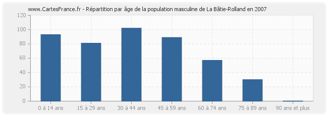 Répartition de la population masculine de La Bâtie-Rolland par âge en 2007 :