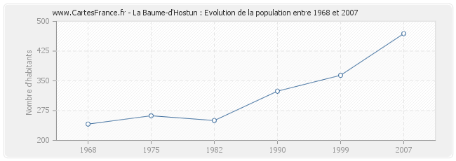 La population de La Baume-d'Hostun était de 469 habitants en 2007, 364 habitants en 1999, 324 habitants en 1990, 250 habitants en 1982, 262 habitants en 1975 et 241 habitants en 1968.