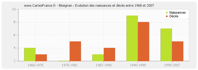 Bésignan : évolution des naissances et décès de 1968 à 2007