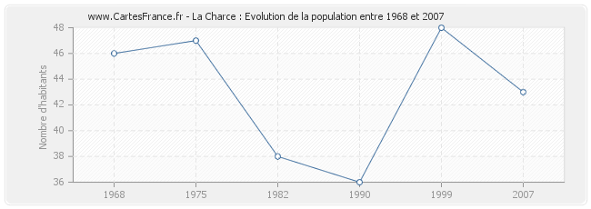 La population de La Charce était de 43 habitants en 2007, 48 habitants en 1999, 36 habitants en 1990, 38 habitants en 1982, 47 habitants en 1975 et 46 habitants en 1968.