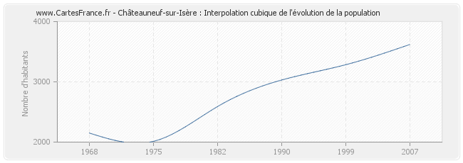 Cette courbe reprend l'historique de la population de Châteauneuf-sur-Isère de 1968 à 2007 en interpolation cubique. Ceci permet d'obtenir plus précisément la population de la commune de Châteauneuf-sur-Isère les années ou aucun recensement n'a été effectué.