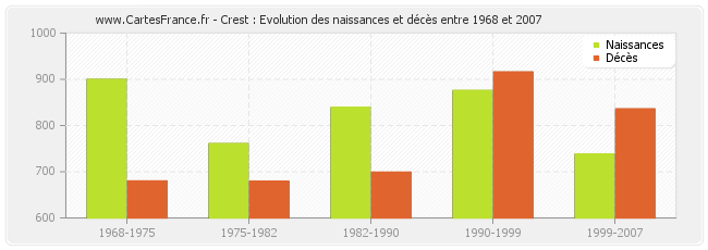 La population de Crest était de 7 789 habitants en 2007, 7 740 habitants en 1999, 7 583 habitants en 1990, 7 518 habitants en 1982, 7 519 habitants en 1975 et 7 140 habitants en 1968.