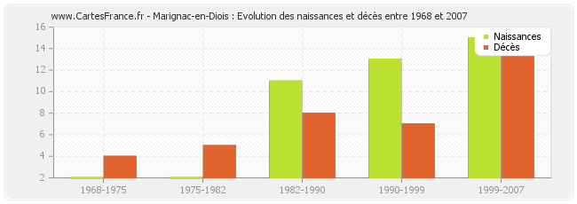 Marignac-en-Diois : évolution des naissances et décès de 1968 à 2007