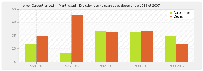 Montrigaud : évolution des naissances et décès de 1968 à 2007