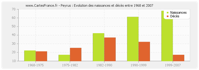 Peyrus : évolution des naissances et décès de 1968 à 2007