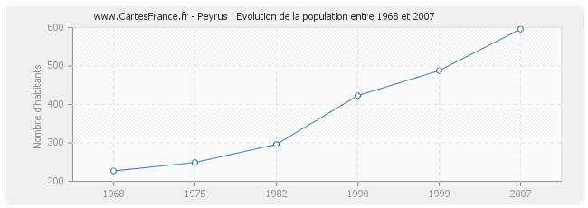 La population de Peyrus était de 596 habitants en 2007, 488 habitants en 1999, 423 habitants en 1990, 296 habitants en 1982, 249 habitants en 1975 et 227 habitants en 1968.