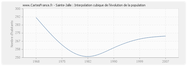 Cette courbe reprend l'historique de la population de Sainte-Jalle de 1968 à 2007 en interpolation cubique. Ceci permet d'obtenir plus précisément la population de la commune de Sainte-Jalle les années ou aucun recensement n'a été effectué.