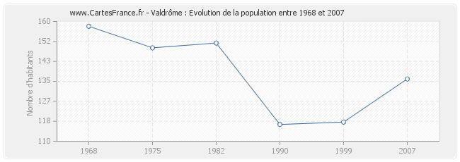 La population de Valdrôme était de 136 habitants en 2007, 118 habitants en 1999, 117 habitants en 1990, 151 habitants en 1982, 149 habitants en 1975 et 158 habitants en 1968.
