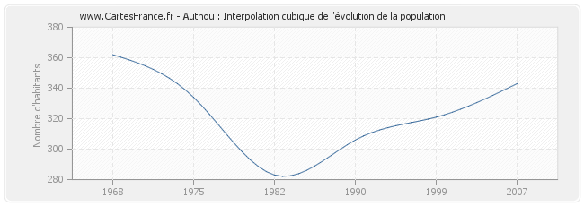 Cette courbe reprend l'historique de la population d'Authou de 1968 à 2007 en interpolation cubique. Ceci permet d'obtenir plus précisément la population de la commune d'Authou les années ou aucun recensement n'a été effectué.