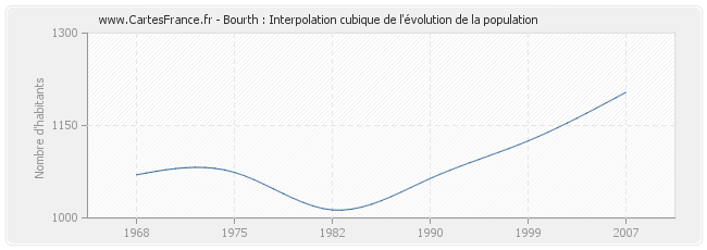 Cette courbe reprend l'historique de la population de Bourth de 1968 à 2007 en interpolation cubique. Ceci permet d'obtenir plus précisément la population de la commune de Bourth les années ou aucun recensement n'a été effectué.