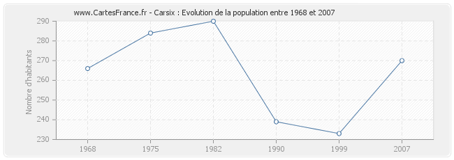 La population de Carsix était de 270 habitants en 2007, 233 habitants en 1999, 239 habitants en 1990, 290 habitants en 1982, 284 habitants en 1975 et 266 habitants en 1968.