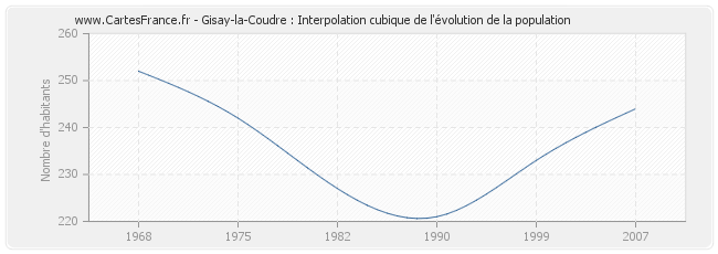 Cette courbe reprend l'historique de la population de Gisay-la-Coudre de 1968 à 2007 en interpolation cubique. Ceci permet d'obtenir plus précisément la population de la commune de Gisay-la-Coudre les années ou aucun recensement n'a été effectué.