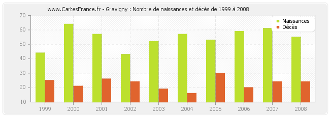 - Gravigny en 2008 : 55 naissances et 24 décès