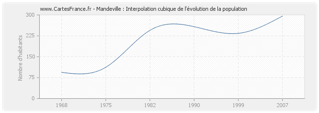 Cette courbe reprend l'historique de la population de Mandeville de 1968 à 2007 en interpolation cubique. Ceci permet d'obtenir plus précisément la population de la commune de Mandeville les années ou aucun recensement n'a été effectué.