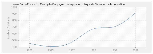 Cette courbe reprend l'historique de la population de Marcilly-la-Campagne de 1968 à 2007 en interpolation cubique. Ceci permet d'obtenir plus précisément la population de la commune de Marcilly-la-Campagne les années ou aucun recensement n'a été effectué.