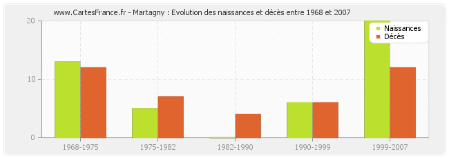 Martagny : évolution des naissances et décès de 1968 à 2007
