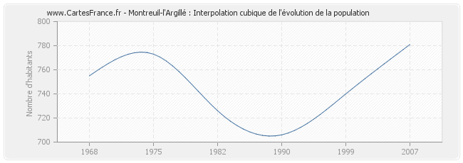 Cette courbe reprend l'historique de la population de Montreuil-l'Argillé de 1968 à 2007 en interpolation cubique. Ceci permet d'obtenir plus précisément la population de la commune de Montreuil-l'Argillé les années ou aucun recensement n'a été effectué.