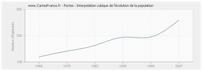 Cette courbe reprend l'historique de la population de Portes de 1968 à 2007 en interpolation cubique. Ceci permet d'obtenir plus précisément la population de la commune de Portes les années ou aucun recensement n'a été effectué.