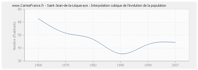 Cette courbe reprend l'historique de la population de Saint-Jean-de-la-Léqueraye de 1968 à 2007 en interpolation cubique. Ceci permet d'obtenir plus précisément la population de la commune de Saint-Jean-de-la-Léqueraye les années ou aucun recensement n'a été effectué.