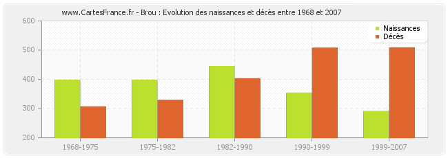 Cette courbe reprend l'historique de la population de Brou de 1968 à 2007 en interpolation cubique. Ceci permet d'obtenir plus précisément la population de la commune de Brou les années ou aucun recensement n'a été effectué.