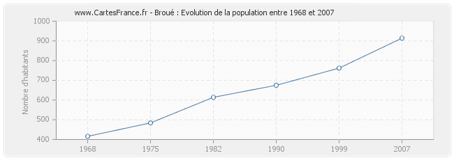 Cette courbe reprend l'historique de la population de Broué de 1968 à 2007 en interpolation cubique. Ceci permet d'obtenir plus précisément la population de la commune de Broué les années ou aucun recensement n'a été effectué.