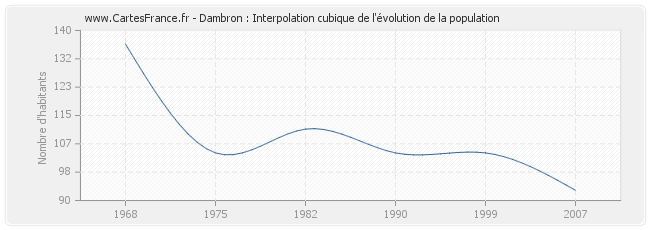 Cette courbe reprend l'historique de la population de Dambron de 1968 à 2007 en interpolation cubique. Ceci permet d'obtenir plus précisément la population de la commune de Dambron les années ou aucun recensement n'a été effectué.