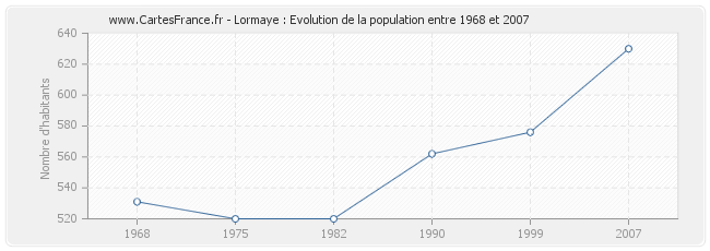 La population de Lormaye était de 630 habitants en 2007, 576 habitants en 1999, 562 habitants en 1990, 520 habitants en 1982, 520 habitants en 1975 et 531 habitants en 1968.