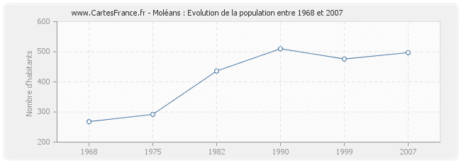 Cette courbe reprend l'historique de la population de Moléans de 1968 à 2007 en interpolation cubique. Ceci permet d'obtenir plus précisément la population de la commune de Moléans les années ou aucun recensement n'a été effectué.