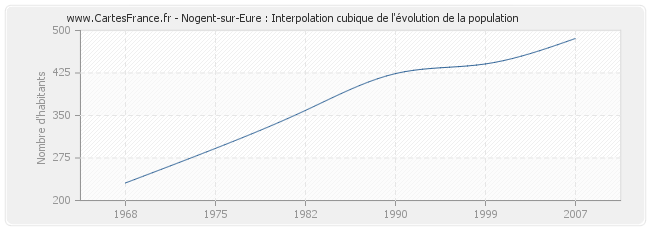 Cette courbe reprend l'historique de la population de Nogent-sur-Eure de 1968 à 2007 en interpolation cubique. Ceci permet d'obtenir plus précisément la population de la commune de Nogent-sur-Eure les années ou aucun recensement n'a été effectué.