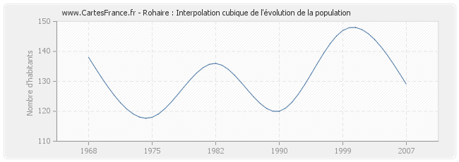 Cette courbe reprend l'historique de la population de Rohaire de 1968 à 2007 en interpolation cubique. Ceci permet d'obtenir plus précisément la population de la commune de Rohaire les années ou aucun recensement n'a été effectué.