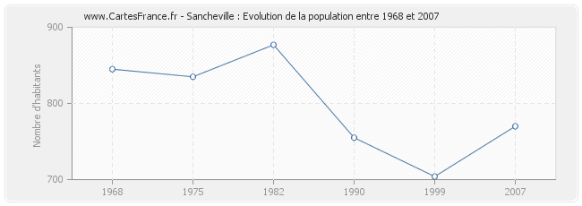 La population de Sancheville était de 770 habitants en 2007, 704 habitants en 1999, 755 habitants en 1990, 877 habitants en 1982, 835 habitants en 1975 et 845 habitants en 1968.