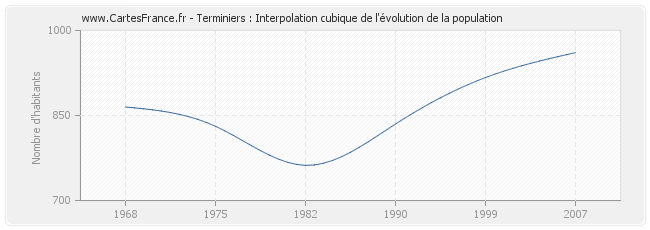 Cette courbe reprend l'historique de la population de Terminiers de 1968 à 2007 en interpolation cubique. Ceci permet d'obtenir plus précisément la population de la commune de Terminiers les années ou aucun recensement n'a été effectué.