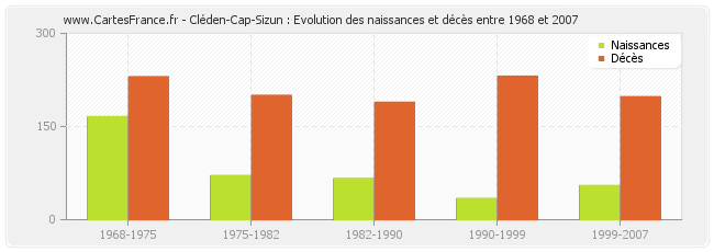 Cléden-Cap-Sizun : évolution des naissances et décès de 1968 à 2007