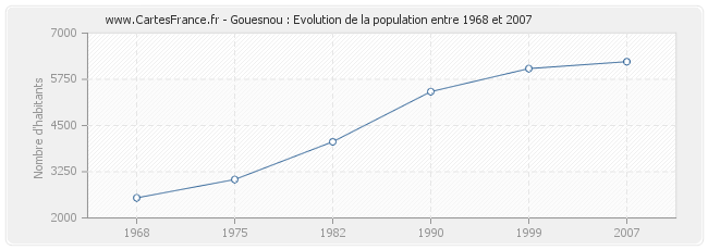 La population de Gouesnou était de 6 228 habitants en 2007, 6 041 habitants en 1999, 5 417 habitants en 1990, 4 061 habitants en 1982, 3 040 habitants en 1975 et 2 543 habitants en 1968.