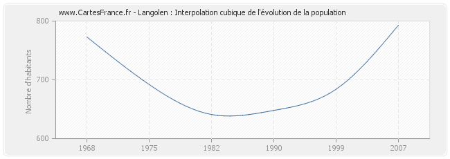 Cette courbe reprend l'historique de la population de Langolen de 1968 à 2007 en interpolation cubique. Ceci permet d'obtenir plus précisément la population de la commune de Langolen les années ou aucun recensement n'a été effectué.