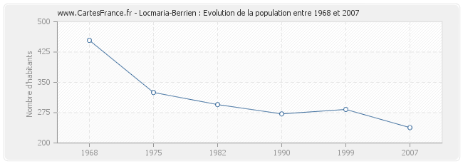 Cette courbe reprend l'historique de la population de Locmaria-Berrien de 1968 à 2007 en interpolation cubique. Ceci permet d'obtenir plus précisément la population de la commune de Locmaria-Berrien les années ou aucun recensement n'a été effectué.