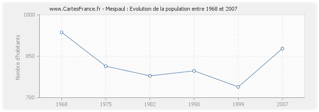 La population de Mespaul était de 878 habitants en 2007, 739 habitants en 1999, 797 habitants en 1990, 779 habitants en 1982, 814 habitants en 1975 et 937 habitants en 1968.