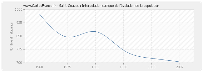 Cette courbe reprend l'historique de la population de Saint-Goazec de 1968 à 2007 en interpolation cubique. Ceci permet d'obtenir plus précisément la population de la commune de Saint-Goazec les années ou aucun recensement n'a été effectué.