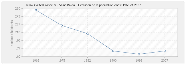 La population de Saint-Rivoal était de 172 habitants en 2007, 165 habitants en 1999, 172 habitants en 1990, 208 habitants en 1982, 225 habitants en 1975 et 257 habitants en 1968.