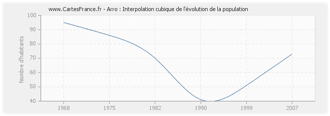 Cette courbe reprend l'historique de la population d'Arro de 1968 à 2007 en interpolation cubique. Ceci permet d'obtenir plus précisément la population de la commune d'Arro les années ou aucun recensement n'a été effectué.