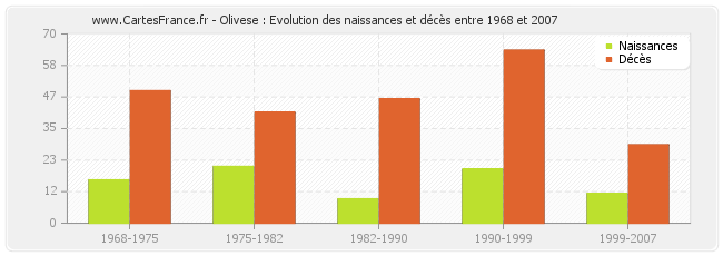 Olivese : évolution des naissances et décès de 1968 à 2007