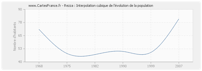 Cette courbe reprend l'historique de la population de Rezza de 1968 à 2007 en interpolation cubique. Ceci permet d'obtenir plus précisément la population de la commune de Rezza les années ou aucun recensement n'a été effectué.