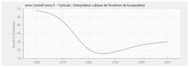 Cette courbe reprend l'historique de la population de Carticasi de 1968 à 2007 en interpolation cubique. Ceci permet d'obtenir plus précisément la population de la commune de Carticasi les années ou aucun recensement n'a été effectué.