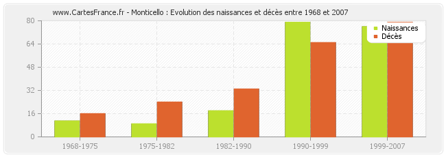 Monticello : évolution des naissances et décès de 1968 à 2007